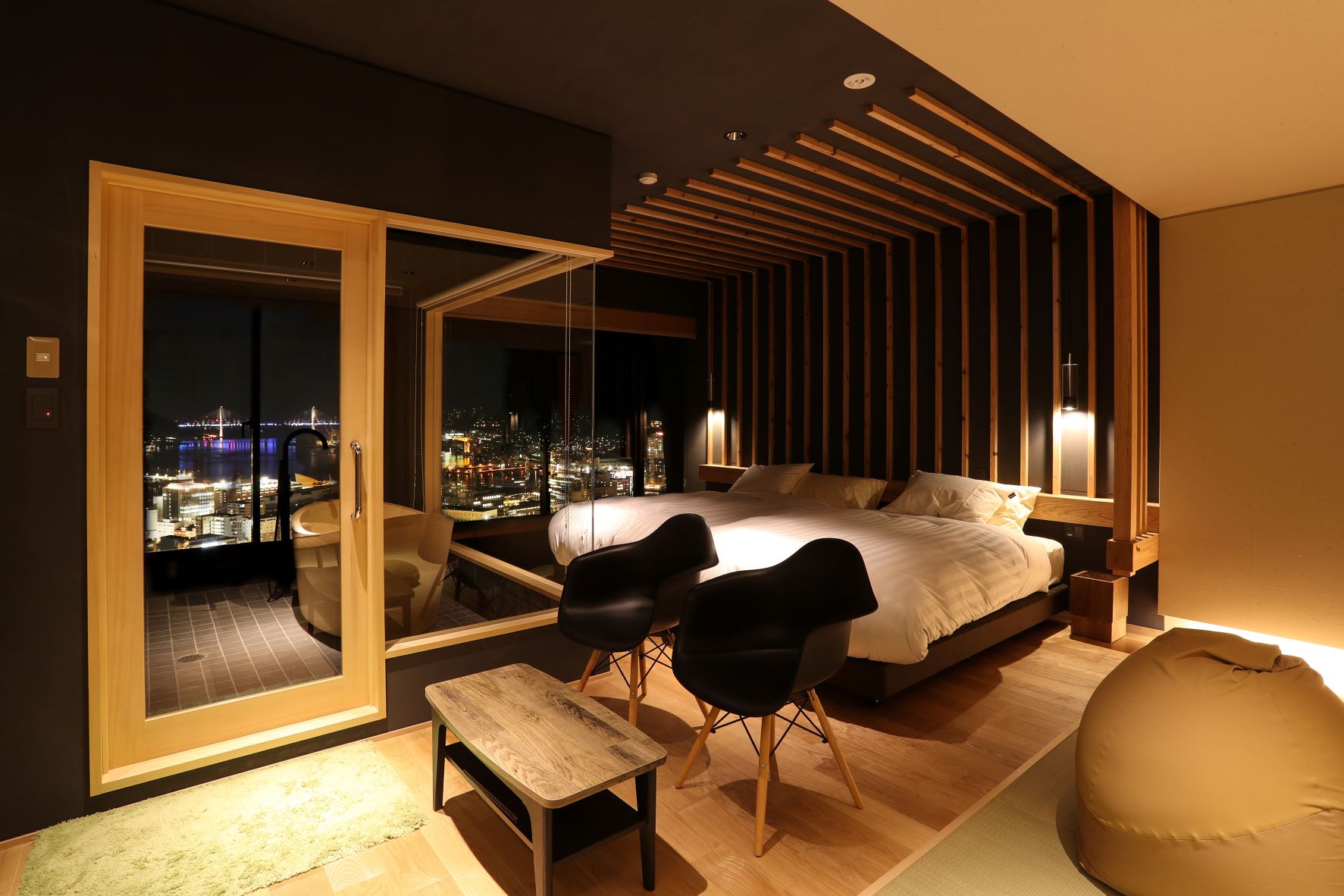 ベッドの奥のカウンターは掘りごたつ式になっており、眼下に長崎の素晴らしい景色を眺めながら好きな時間を過ごすことができます。